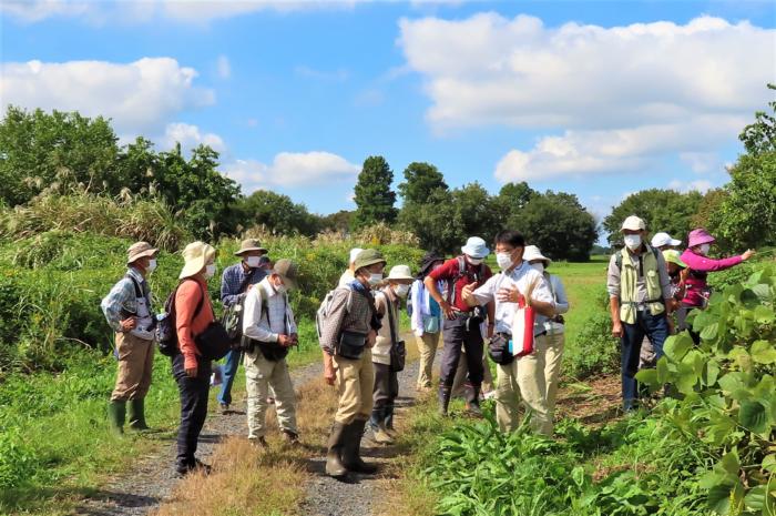 渡良瀬遊水地内を講師を囲みながらの観察会