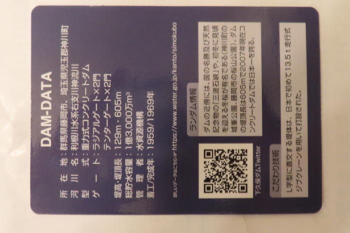 下久保ダム管理事務所で頂いた「下久保ダムカード」表面