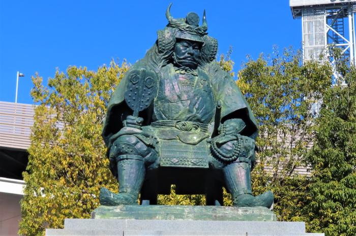 甲府駅南口に設置されている「武田信玄公之像」川中島の陣中の姿を模しています
