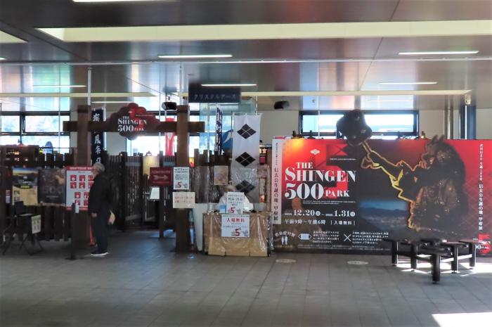 信玄公生誕500周年を記念して駅連絡通路に設置された「ザ・シンゲン500パーク」武田家の歴史やゆかりの地の等の紹介をしています、R4年1月31日迄の期限設置
