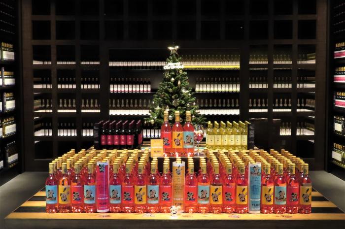 サドヤワイナリー内のクリスマス仕様のワインディスプレイ