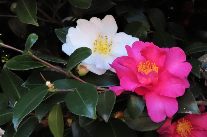 緑のヘルシーロード沿いに咲いていた紅白のサザンカ