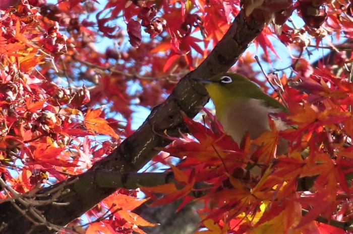 公園の紅葉に戯れていたメジロ
