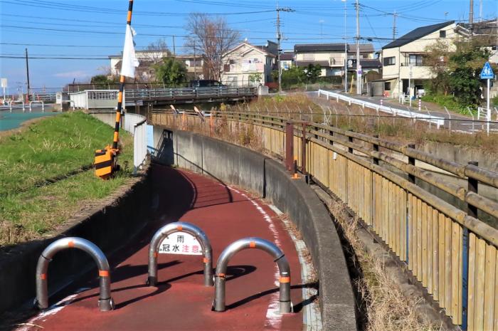 珍しく遮断機が付いているさいたま栗橋線の下を潜る自転車・歩行者用アンダーパス、溢れると遮断機が下がり通行止めにする