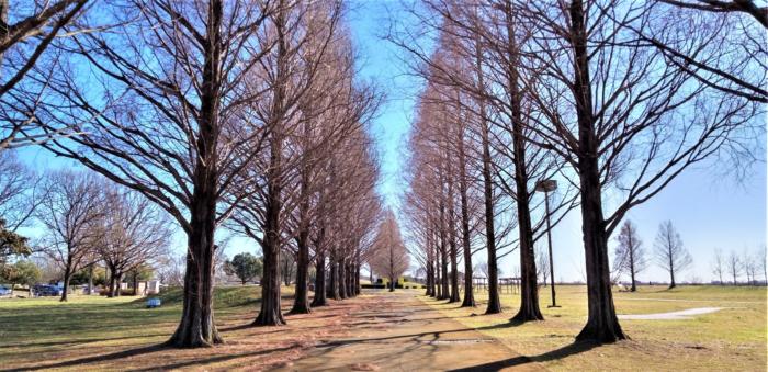 アイキャッチ画像は子ども広場にある冬枯れしたメタセコイヤ並木