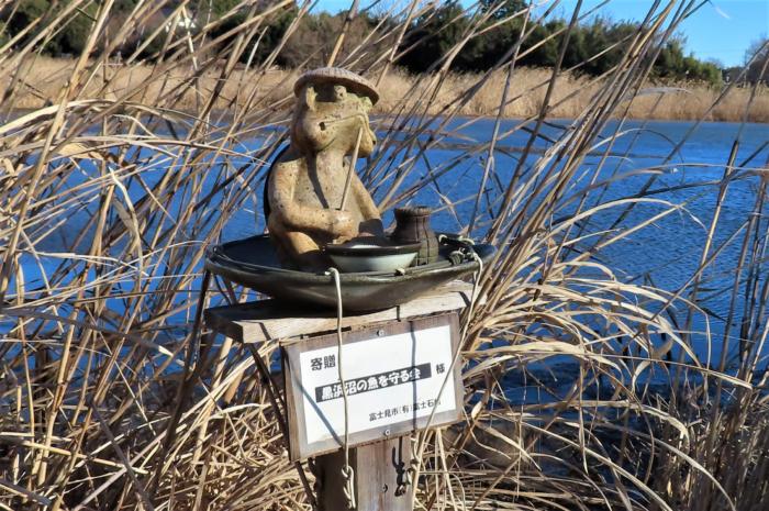 黒浜沼の岸に置かれている蛙と思えるオブジェ