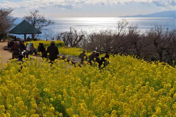 山頂部の菜の花と輝く相模湾、右奥には伊豆半島