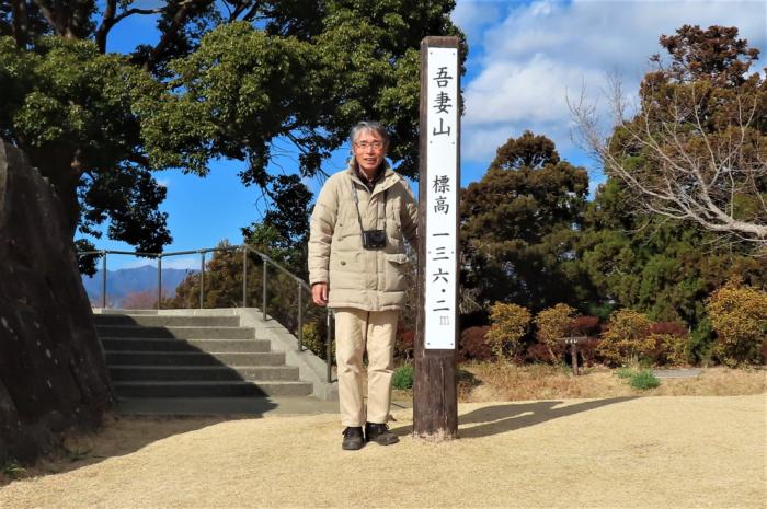吾妻山(三角点)標識と共に 標高136.2m