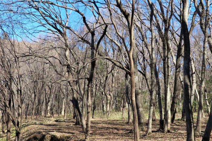 冬枯れの森に明るく暖かい春の陽ざしがそそいでいます