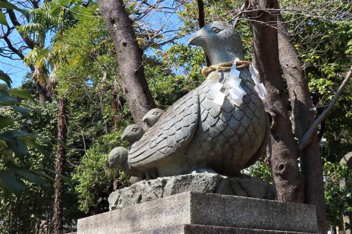 大谷場氷川神社の吽形の狛キジ 雛が三羽