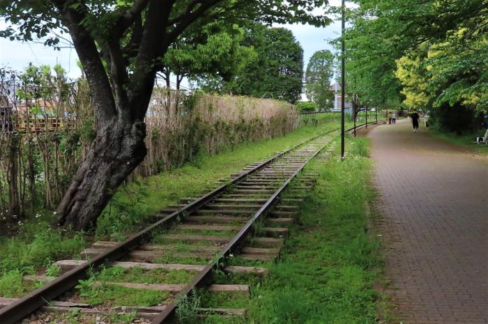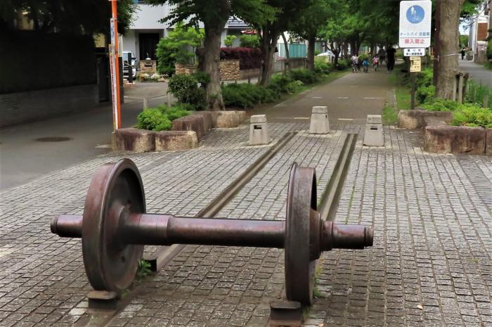 西寒川支線廃線跡に遊歩道となった「一之宮緑道」所々に線路が敷設されて残っています