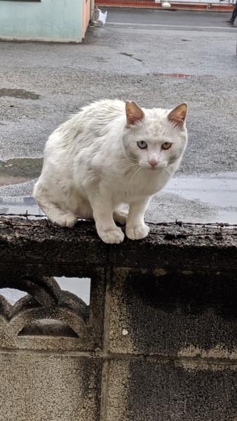 目と目が合ってしまいました デカい白い猫! 器用に塀の上に! すでに一匹居るので 大変申し訳有りませんm(_ _)m もう飼えない(༎ຶ ෴ ༎ຶ)