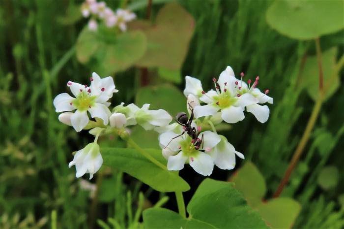 近所を散歩していましたら春に蒔いた蕎麦の花が綺麗に咲き揃ってきましたのでご紹介いたします、蕎麦は約90日位で収穫できるので6月待つくらいには夏新そばが頂けるのかな。 アイキャッチ画像は受粉を手助けしているアリ…? 蕎麦開…