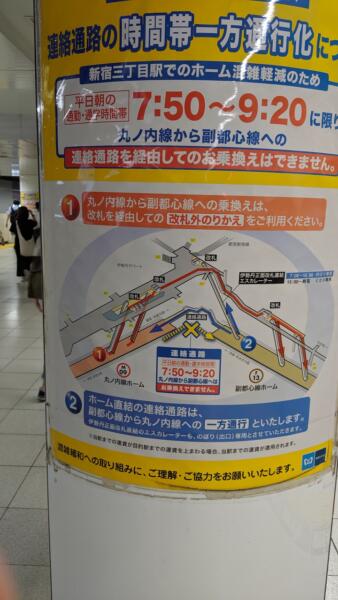 乗り換えが一方通行なんですね╮(╯_╰)╭ 通路が狭いせいなんですかね 係員さんが、しっかり立ってる\(°o°)/