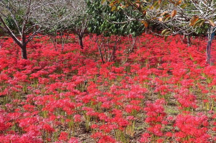 1年を通して様々な花を見ることができる花園。この時期は約30,000株の真っ赤な曼珠沙華が一面を埋めつくします。春は桜、夏はキツネノカミソリ、冬はロウバイ、マンサクと四季折々に楽しめる花園です。