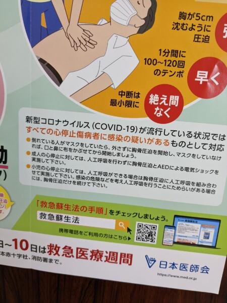 2022.10.27 木村浩 akasaka この騒ぎで救急救命にも\(°o°)/ 心肺蘇生のポスターです かなり以前から こんな感じでのポスターでした 特に気にしては居なかったのですが よく見ると みんなマスクをしているんですね! 4 件のコメント 現在の救急法では人工呼吸は推奨していません、心臓マッサージをする事で胸部圧迫をすることにより多少空気の流入が出来るとの事で、しっかりと心臓マッサージやAEDでの蘇生をするようにと言われています、更にマスクは感染症予防もあるためです、時折消防署で研修会が行われていますので都合が良いければ参加して見て下さい。 返信する 現在は開催の回数も減っている との事ですね いろいろな所で 影響が出ているんてやすね 返信する 救急救命も コロナ禍で 命がけですよね。 医療従事者の方々には頭が下がります。 返信する 救急車関係者にも 感謝ですね 返信する コメントを残す コメントをキャンセルメールアドレスが公開されることはありません。 ※ が付いている欄は必須項目ですコメント ※ 名前 メール サイト 次回のコメントで使用するためブラウザーに自分の名前、メールアドレス、サイトを保存する。