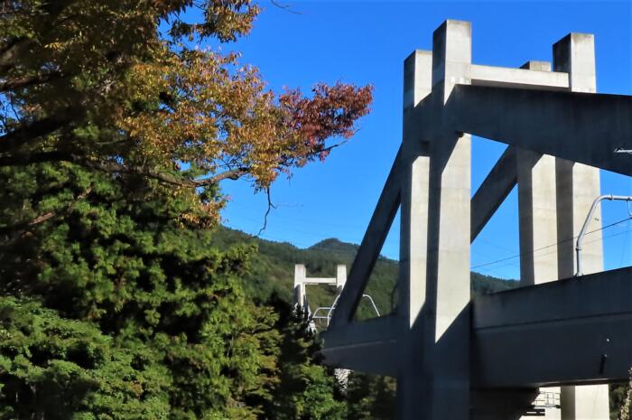 駅からハイキング「名勝(吾妻峡)を巡る渓谷紅葉ハイキング」に参加、コースは吾妻線岩島駅をスタート⇒道の駅あがつま峡⇒渓谷パーキング⇒猿橋⇒若葉台⇒紅葉台⇒旧熊の茶屋⇒鹿飛橋⇒道の駅あがつま峡⇒岩島駅、約11㌔、約4時間、国指定名勝「吾妻峡」は、2019年度完成の「八ッ場ダム」の下流にあり、「関東の耶馬渓」とも呼ばれる美しい渓谷です、一時期はダムの建設場所が今よりも下流域に設置予定のため吾妻峡の一部が沈んでしまう心配がありましたが地元での意見が反映されて大半が保護されたおかげで貴重な渓谷美を堪能する事が出来ました。谷が深く光が差し込まないので思うような写真が撮れませんでした。紅葉は色付き始まったばかりでした。