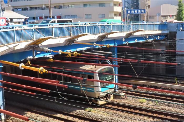 東海道線・京浜東北線・横須賀線・京急等複数の路線にかかる跨線橋の「青木橋」日本最初の跨線橋で現在の橋は2代目で、1971年(昭和46年)3月の竣工。初代は1780年に竣工