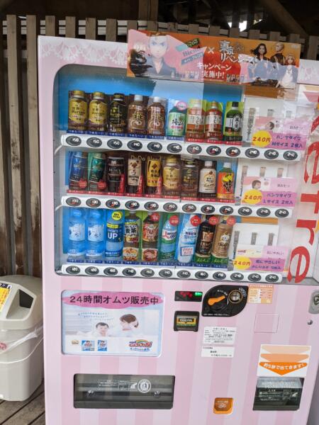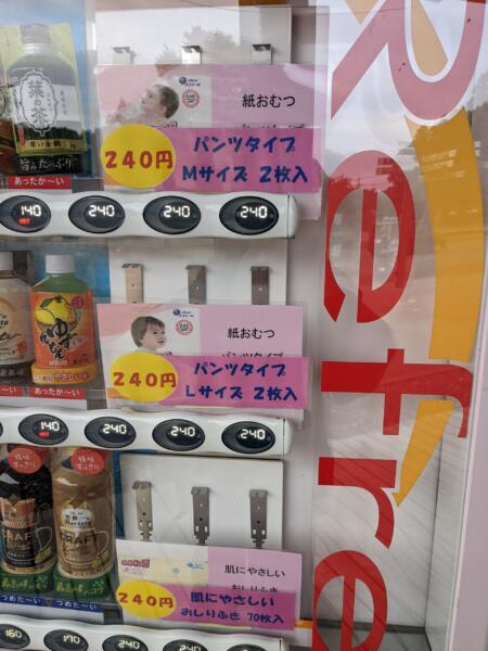 ドリンクと紙おむつが一緒の自販機なんてあるんですね。
