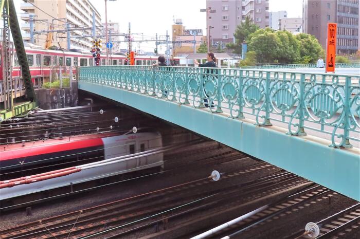 東海道と東海道線をり立体交差させるため1872年に竣工した日本初の跨線橋「八ッ山橋」