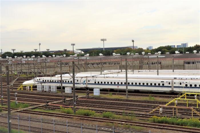 JR東海の新幹線車両基地に並ぶN700系の車両たち