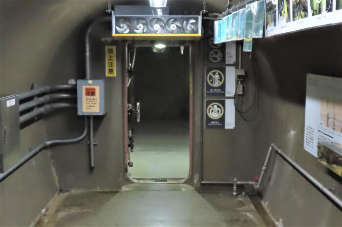 下水道館ないにある下水道管への通路、潜水艦に付いているような頑丈な防水扉の奥が下水道本管になります、