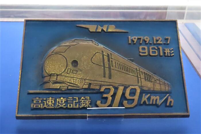 新幹線資料館に展示している961形高速度319㌔記録銘版