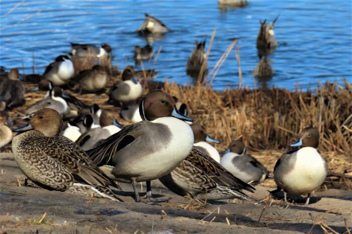 岸に上がって居るオナガカモの群れ