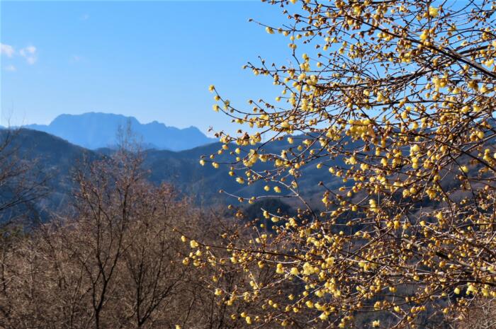 ロウバイ園越しの独立峰「美の山(蓑山)」