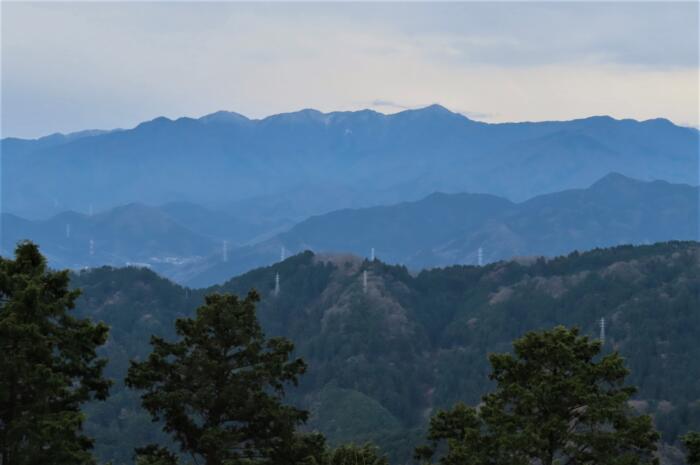 高尾山山頂より丹沢山地を望みます、中央から少し右に寄った三角形の山が丹沢山系最高峰の蛭ヶ岳です