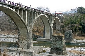 昭和6年5月に竣工した鉄筋コンクリート造りの三連アーチ橋の二代目「旧秩父橋」、橋長134.6m、幅員6mで現在は橋上公園になっています、現在改修工事中思うような写真が撮れない為写真は秩父市HPより流用しています