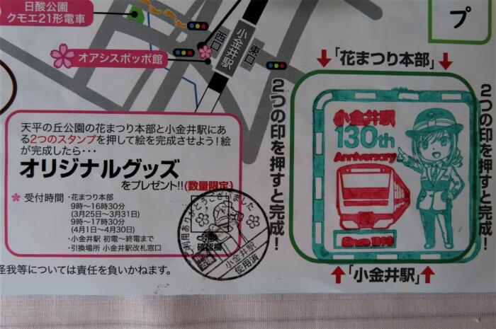 小金井駅と天平の丘公園で別々にスタンプを押すと一つの絵柄が完成します、駅にて記念品と交換できます