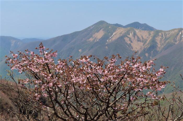 高嶺桜越しに会津と上総の境をなす大倉尾根を望む