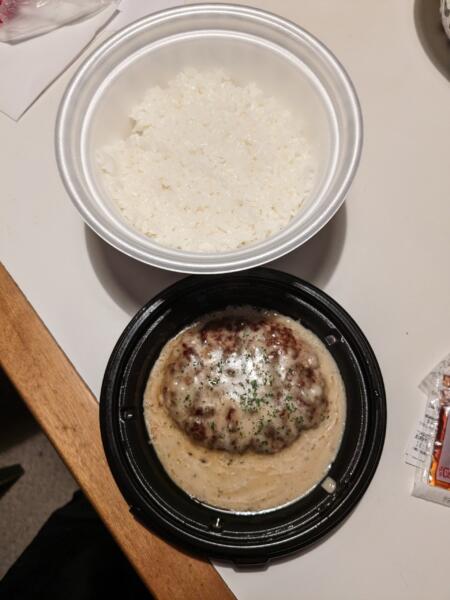 ハンバーグは ヤケクソハンバーグが ほとんどですね あまり食べないですね と言いながら 松屋のハンバーグ ホワイトソースかけ!特盛りライス ライスは、また後で食べます さすがに食べきらない