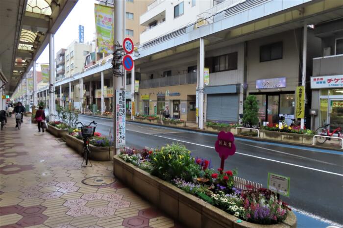 約850mにわたり花々で彩られた古くって新しい「フラワーロード商店街」です