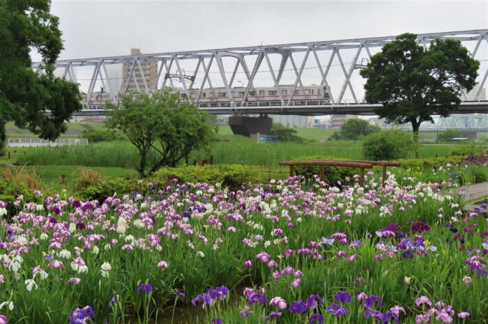 小岩菖蒲園 京成線の鉄橋がそばにあります