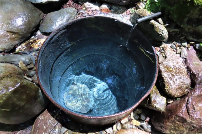 明ヶ指たまご水の湧出口、鉢の底には白い湯の花が沈殿しています