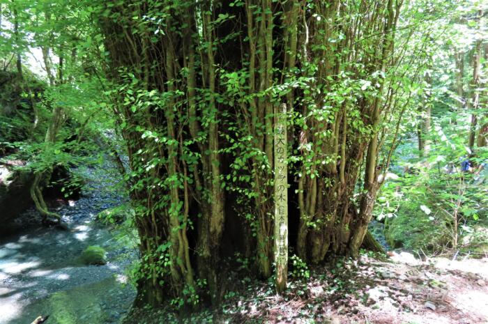 県内トップクラスのカツラの巨木の「明ヶ指の大カツラ」、幹周り11m、樹高30m、樹齢は約450年といわれる。