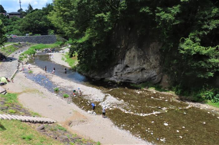 横瀬川に設けられているウォーターパークシラヤマ内にある国の天然記念物に指定されている「新田橋の礫岩露頭」前で水遊び