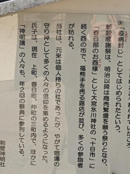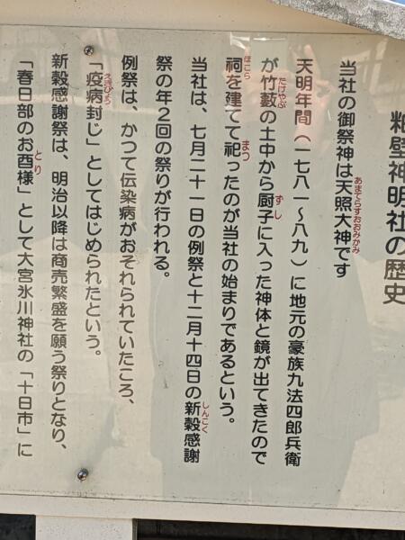祭神は天照大神なんだ。日本の最高神ともいえる神様を祀っているんだね。意外でした。そういえば、昔、市役所に勤めていた九法さんという珍しい名前と思った人がいて、そのひとは、この名家の出だったのかもね。今も春日部に家はあるのかな。上町、春日町は伝統があるね。勉強になりました。ありがとう。