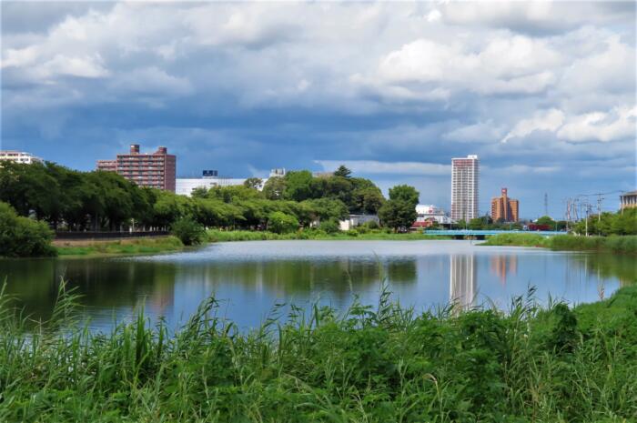 ひまわり広場より大落古利根川越しに市民文化会館や八幡橋方面を望む