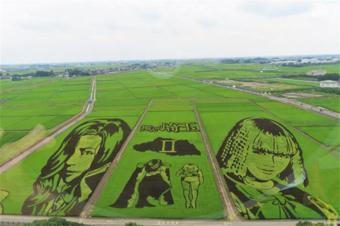 今年の田んぼアートは、『翔んで埼玉』の続編となる映画『翔んで埼玉〜琵琶湖より愛をこめて〜』の2023年全国公開を記念し、映画の主要キャラクターとコラボレーションしたデザインが描かれています。約28,000平方メートル(2.8ha)世界最大級の田んぼアートで7月下旬から10月中旬まで見頃です(色彩のピークは7月下旬から8月下旬)