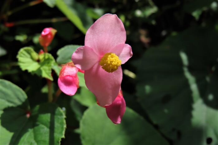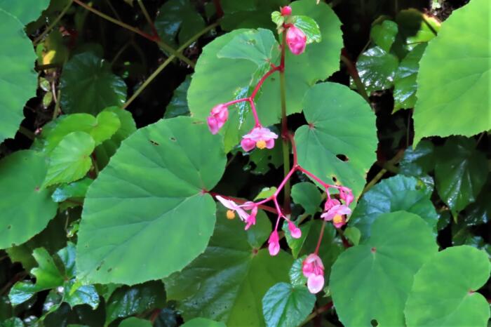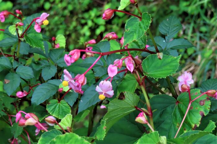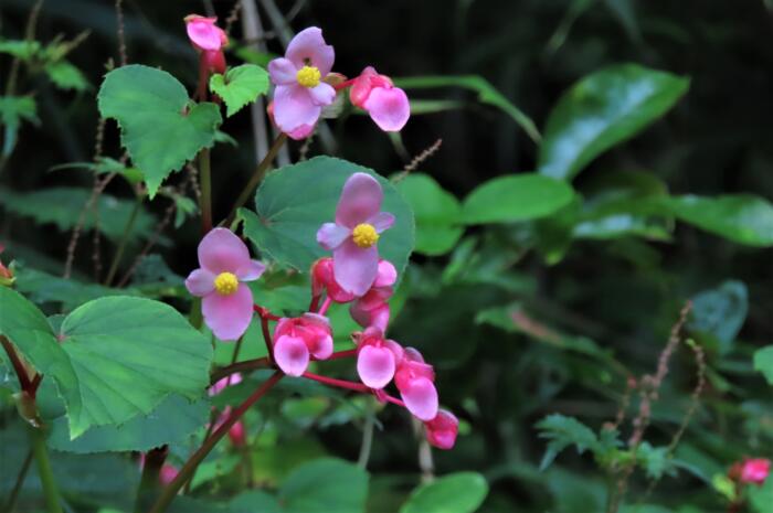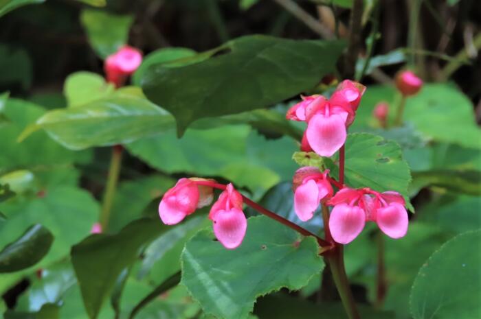 ベゴニアの仲間で湿り気と日陰を好みます、左右大きさが違うハート形の葉のわきから紅い花茎を伸ばし、淡いピンク色の花を下向きに咲かせます。シュウカイドウ(秋海棠)」の花言葉は「片思い」「恋の悩み」、中国原産の多年草、バラ科のカイドウ(海棠)に良く似た花を秋に咲かせる事から名付けられました。