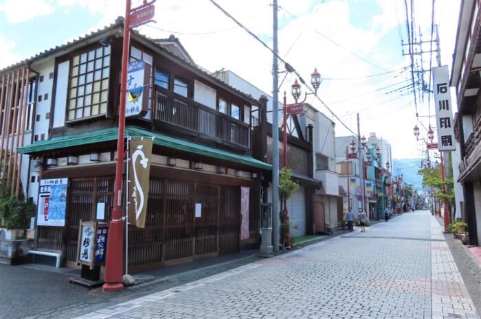 番場通りは秩父神社へ続く、全長約500mの石畳の参道、大正後期から昭和にかけて建てられたモダンな建物が多く残る通りです。