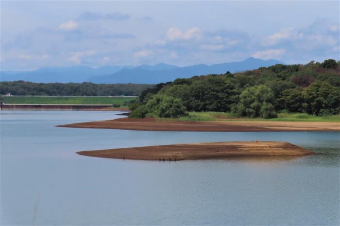 多摩湖堰堤の北側に設置されている「見晴しの丘」より渇水した多摩湖(下)より奥多摩方面を望む