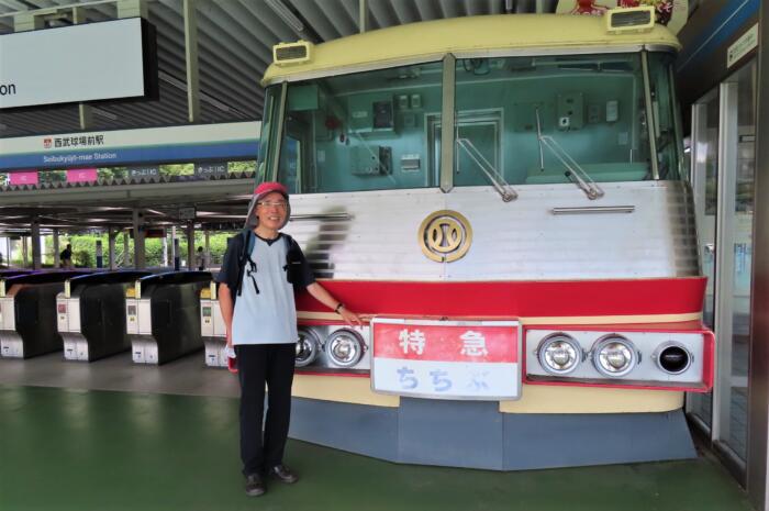 西武球場前駅改札に展示されている初代特急レッドアロー号の運転台