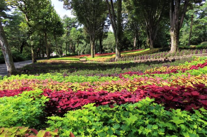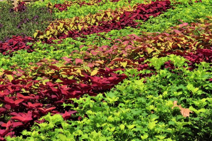 葉色を楽しむカラーリーフで、シソ科の植物。様々な品種があり、葉だけでも驚きのカラフルな風景が広がります。