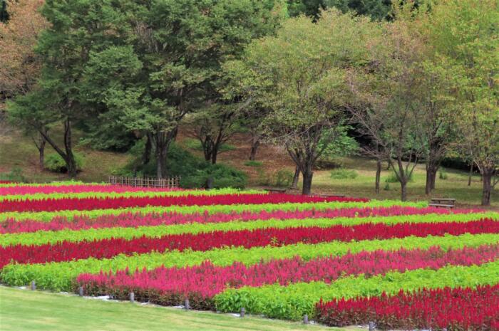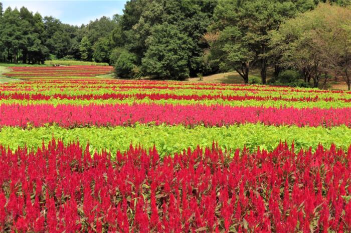 赤・黄・ピンクのカラフルなケイトウ花畑、ケイトウにはいくつか種類がありますが、すらりと伸びる、羽毛ゲイトウです。