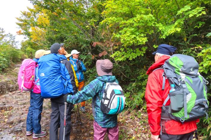 登山ガイドの樹木の案内を聞き入る参加者