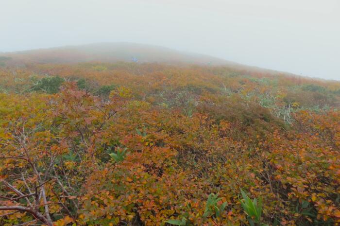 ガスに覆われてる栗駒山中の始まった紅葉